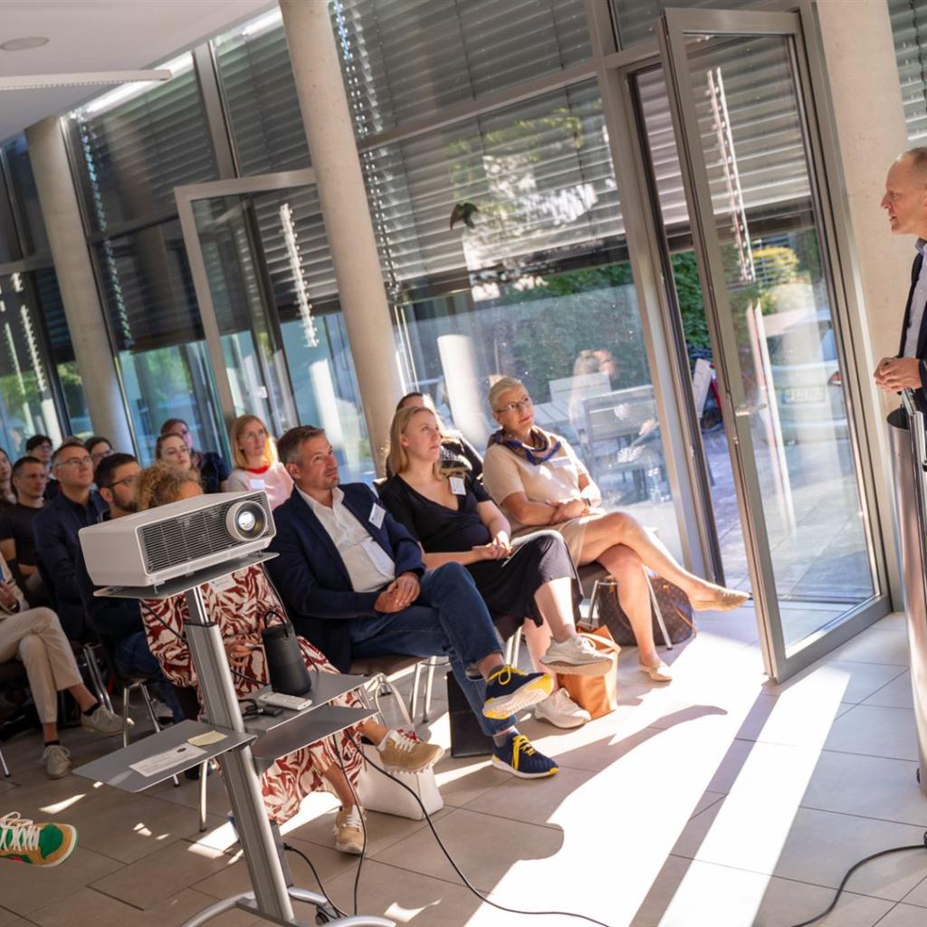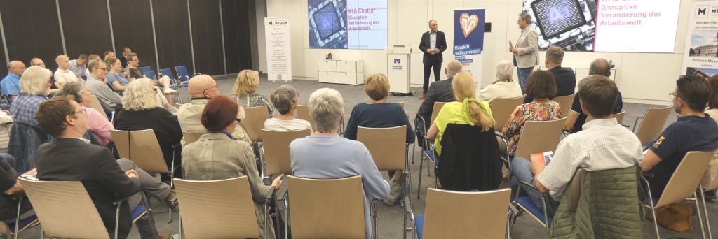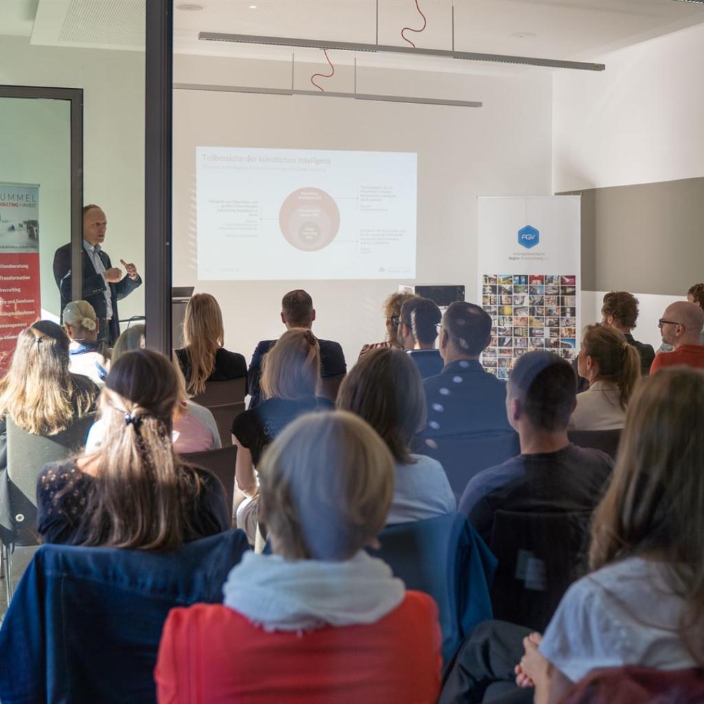 Ob 20 oder 500 Teilnehmer - mit unserer motivierenden Keynote zeigen wir den Teilnehmenden die disruptive Veränderung der Arbeitswelt auf und wecken das Interesse am Thema KI. Dabei gehen wir immer individuell auf die entsprechende Zielgruppe ein.