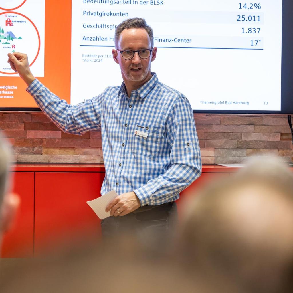 Nach einem Zwischenhalt im Baumwipfelpfad, wo Geschäftsführerin Eva-Christin Ronkainen-Kolb über die Projekte der HarzVenture GmbH berichtete, fand der neunte Themengipfel seinen inspirierenden in den Räumlichkeiten der Braunschweigischen Landessparkasse, wo Lars Dannheim, Silvester Plotka und Mathias Engel (alle BLSK) einen Impuls zu „Zinsen, Inflation und Wirtschaftsausblick 2024 – Wo stehen wir aktuell in Deutschland“ lieferten und Udo Kolle Einblicke in die Arbeit des auf Gefahrgüter spezialisierten Logistikunternehmens PLG mbH gab.